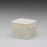 長方圓角象牙小盒,器壁鏤雕菱格紋,盒蓋連一長鏈,下有一如意形墜,在分串兩條短鍊,各串連一只小果盤,為象牙長方套盒中的一件。套盒全器共十一個象牙盒,其中大小形狀不同的十個小盒,皆需裝入最大盒中,十個小盒或附果盤,或連鏈附動物、瓜果,或僅連鏈而以鏤空葫蘆形小牙飾、磬形小牙飾連接,形形色色,不一而足;其中有數個小盒之蓋面、器身飾鏤空活紋。最大盒器身底面陰刻填黑楷款:「乾隆己未巧月,小臣黃振效恭製。」乃在乾隆四年七月完成的作品,原為「『集瓊藻』多寶格」中的文玩之一。黃振效這種連鏈、活紋小盒(尤其是套盒)乃廣東牙匠的絕活,實可謂集精鏤細刻之極致。