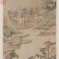 - 文徵明(西元一四七○至一五五九年),江蘇長洲人。初名壁,字徵明,後以字行。亦字徵仲,號停雲生、衡山居士。詩文書畫並佳,畫師沈周,為明四大家之一。緣溪坡陀疊起,平岸參差。遠處一峰聳然,頂平而壁峭。其下松林,隱約在淡煙中,蓋寫雨後之景也。筆極細緻,畫樹之筆頗有稚弱者。徵明早年畫蹟不多,蓋晚成者也。款署丁卯(一五○七)十一月七日,畫時三十八歲。