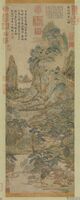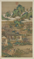 宋趙伯駒春山圖 軸 趙伯駒(1120-1183),字千里,宋太祖七世孫。善畫青綠山水,兼工花卉翎毛,尤長於人物樓臺界畫。本幅畫山水晴雲,遊騎尋春,村家桃柳,水亭茶話。通幅以青綠為主調,生動地表現出春日觸目階綠的景緻。 -