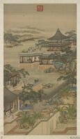 清畫院畫十二月月令圖九月 軸 重陽節是農曆的九月九日,《易經》將九定為陽數,日月逢九,兩陽相重,故名「重陽」。重陽的各種習俗如登高、佩茱萸、賞菊飲酒始於漢代,原先是避禍禳災的迷信成分,隨著歲月的流逝,迷信觀念漸淡,到唐宋已成文人雅士飲酒、賞菊、登高、賦詩的節日。圖中所描繪的正是菊花會的情景,船,運送著盆栽,人,從容地賞玩。野外則遊人提著酒食,登高抒懷,極目遠眺,各種綺麗風光盡收眼底。